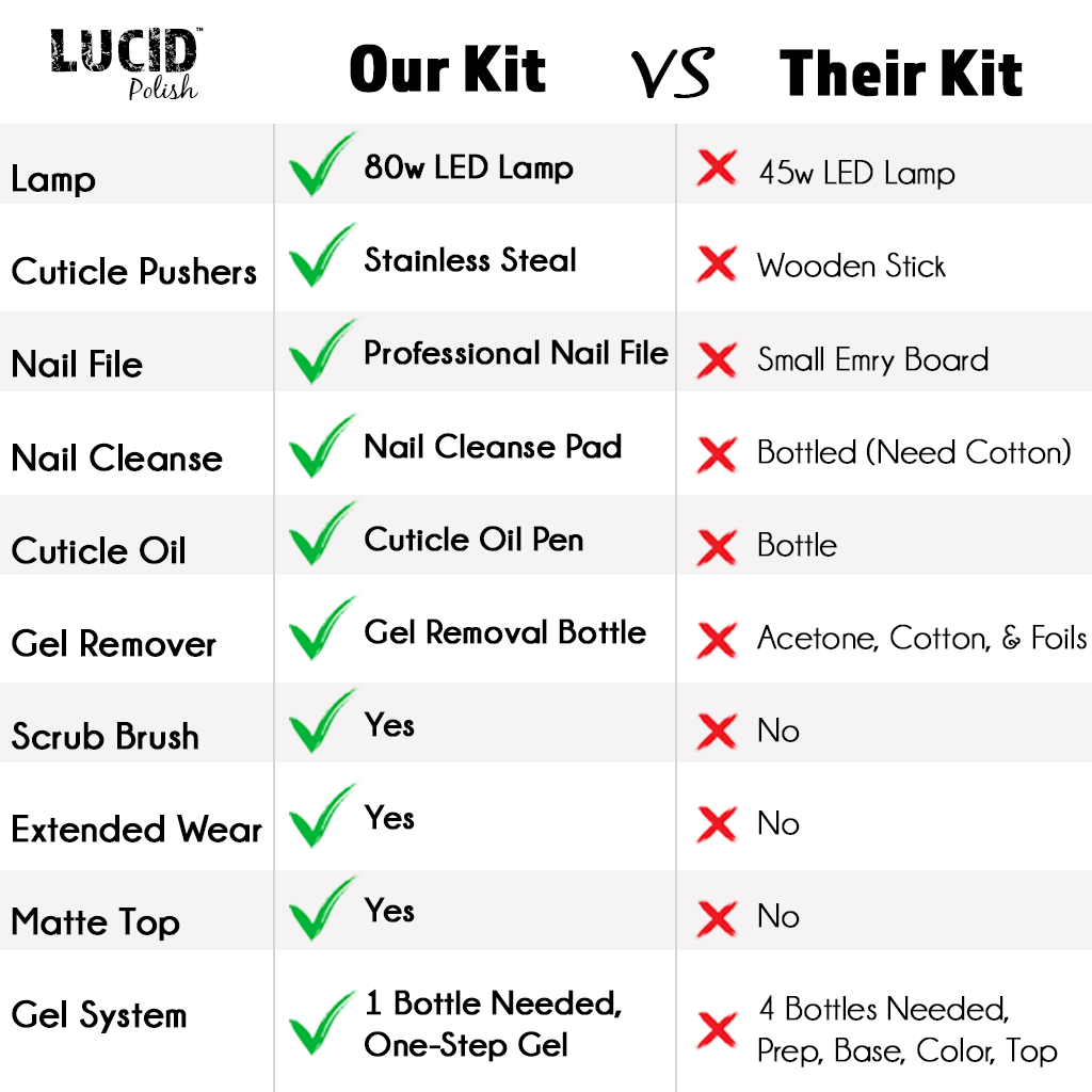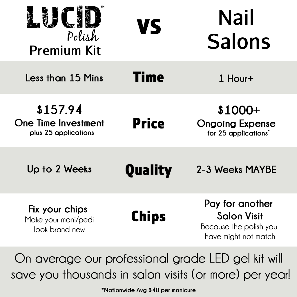 love Lucid polish! Wish we had here in NC Perfect 10 Nail Salons like in SD. The above kit is perfect for at home nail care with Lucid polish. The kit is accompanied with clear directions, and has all that one needs to accomplish great looking nails, that are strong and do not peel. The color selection is amazing. Highly recommend it!